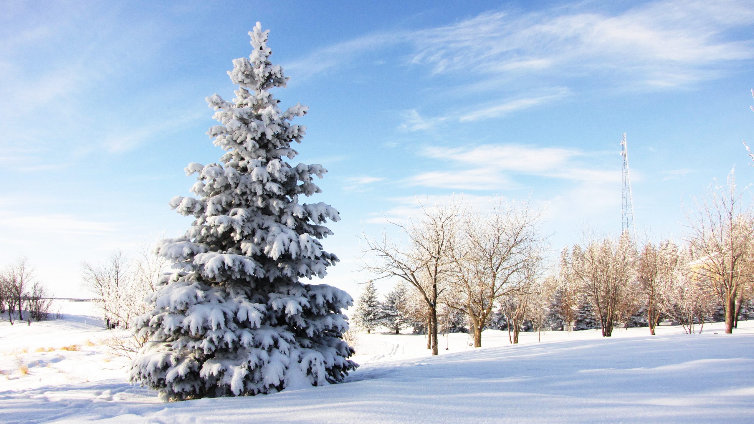 These commemorative trees are part of Darlingford Memorial Park. You can see the prominent Darlingford communications tower visible in the distance—a landmark observable for miles across the Pembina Valley.